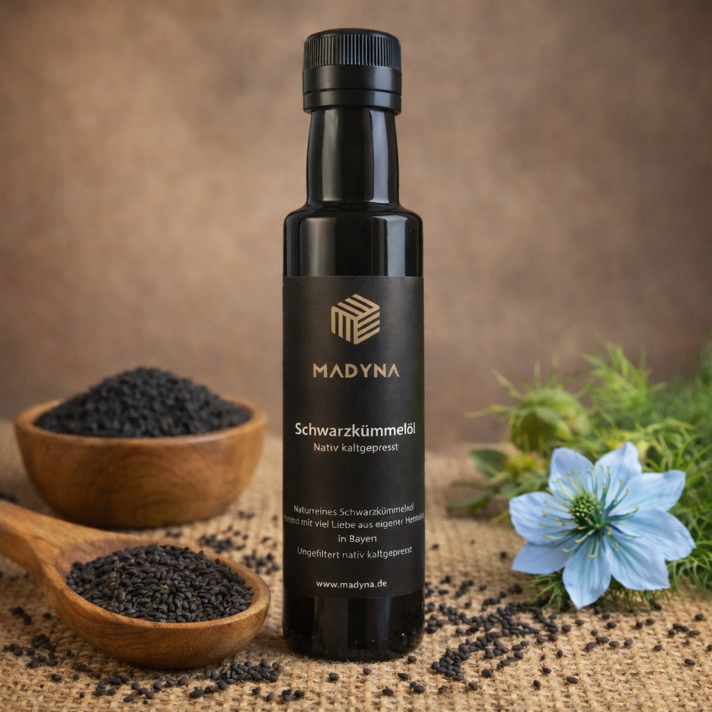 Unser Schwarzkümmelöl wird aus hochwertigen Nigella Sativa-Samen schonend kaltgepresst und ungefiltert abgefüllt. Es stammt aus traditionellem Anbau in Syrien und überzeugt durch Reinheit, vielseitige Anwendungsbereiche und jahrhundertealte Beliebtheit.